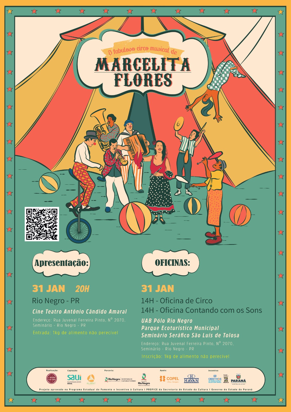 No próximo dia 31 (sexta-feira), o município de Rio Negro receberá o projeto “O Fabuloso Circo Musical de Marcelita Flores”. Trata-se de um divertido show que une a música com o circo. Confira a programação: