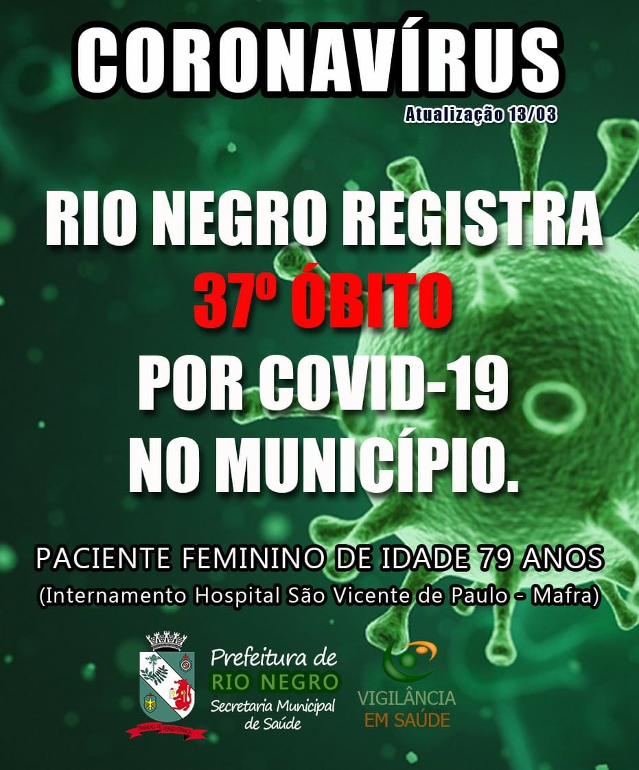 Neste sábado a cidade de Rio Negro registrou a 37ª morte por Covid-19. Trata-se de uma paciente com 79 anos de idade. Ela estava internada na UTI de Mafra.
