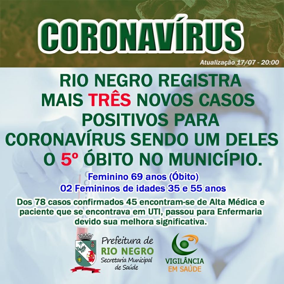 Rio Negro registrou mais três casos positivos e o quinto óbito por Covid-19 nesta sexta-feira (17).