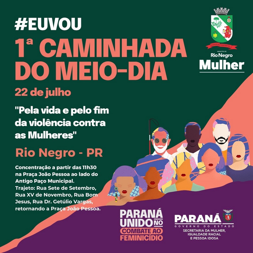 Rio Negro realizará no próximo sábado a 1ª Caminhada do Meio-Dia. O evento faz parte da campanha estadual Paraná Unido no Combate ao FeminicÃdio. A iniciativa prevê a realização de caminhadas descentralizadas em vários municÃpios paranaenses ao meio-dia do dia 22 de julho.