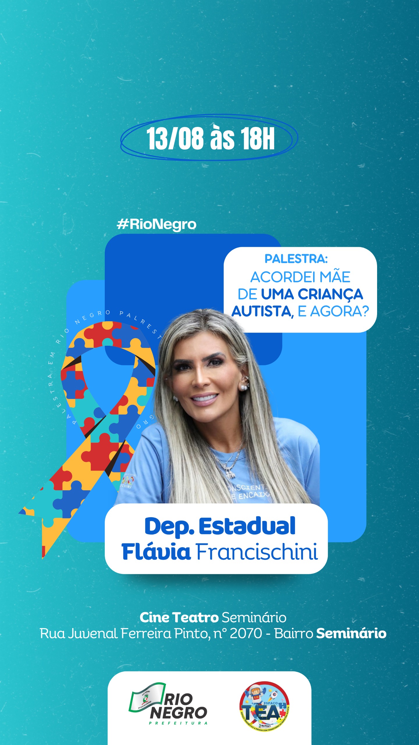 A palestra será ministrada pela deputada estadual Flávia Francischini, que estará em Rio Negro não como parlamentar, mas como mãe de criança autista, seu segundo filho, Bernardo. Em um evento dinâmico a deputada passará ao publico a sua experiência no dia a dia com o autismo.