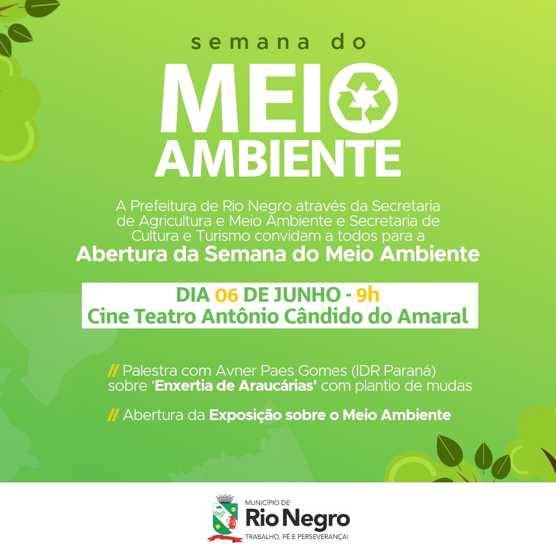 Na próxima segunda-feira, 06 de junho, a Prefeitura Municipal de Rio Negro, através das Secretarias de Agricultura e Meio Ambiente e de Cultura e Turismo, lança a Semana do Meio Ambiente (06 a 10 de junho).