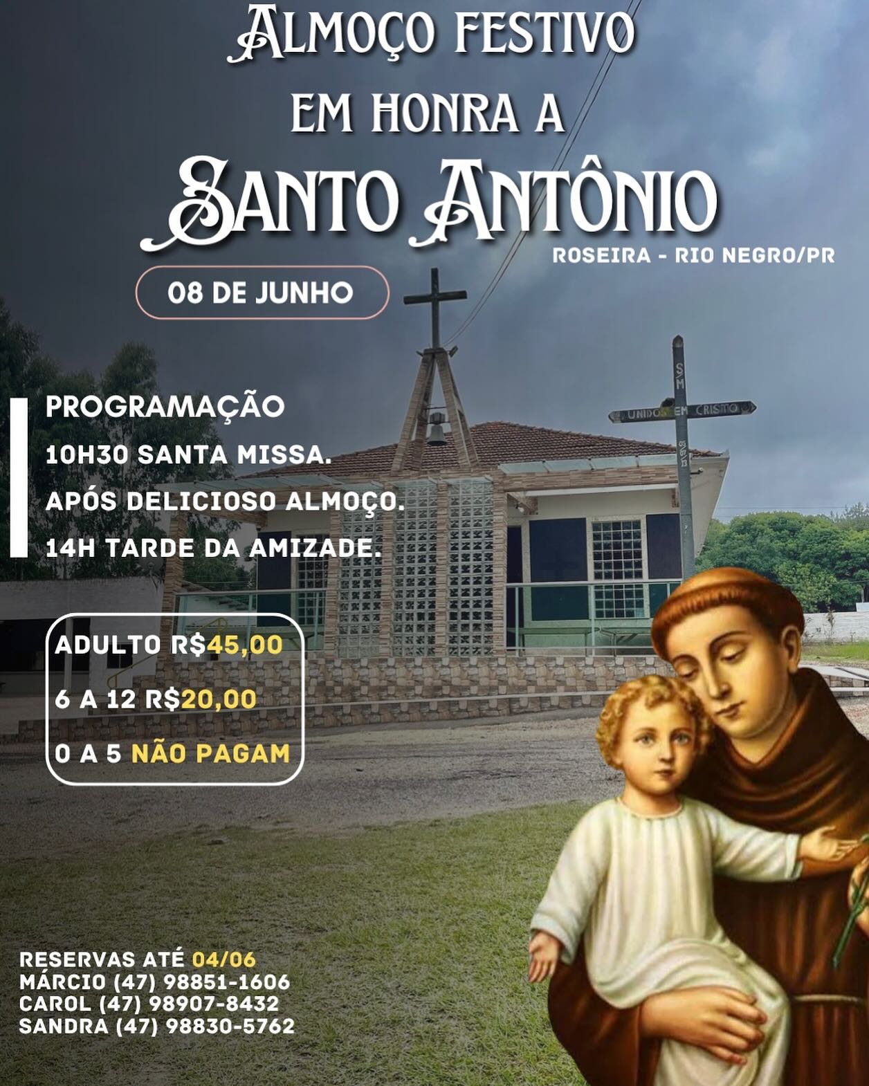 No dia 08 de junho acontecerá o almoço festivo em honra a Santo Antônio na Roseira, em Rio Negro.