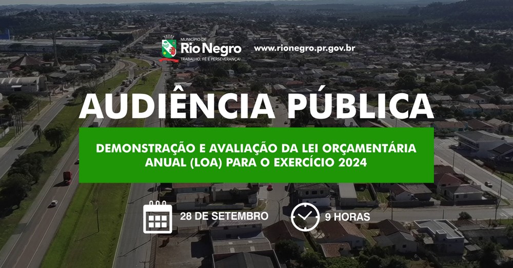 A Prefeitura Municipal de Rio Negro, dando cumprimento à Lei Complementar nº 101, de 04 de maio de 2000, convida a população em geral para participar da Audiência Pública para demonstração e avaliação da Lei Orçamentária Anual (LOA) para o ExercÃcio 2024.
