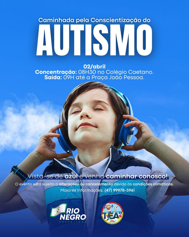 Para celebrar a data e a sua importância, em Rio Negro será realizada a Caminhada pela Conscientização do Autismo. A concentração será às 8h30 em frente ao Colégio Caetano. A saída será às 9h até a Praça João Pessoa. Vista-se de azul e participe deste importante evento!