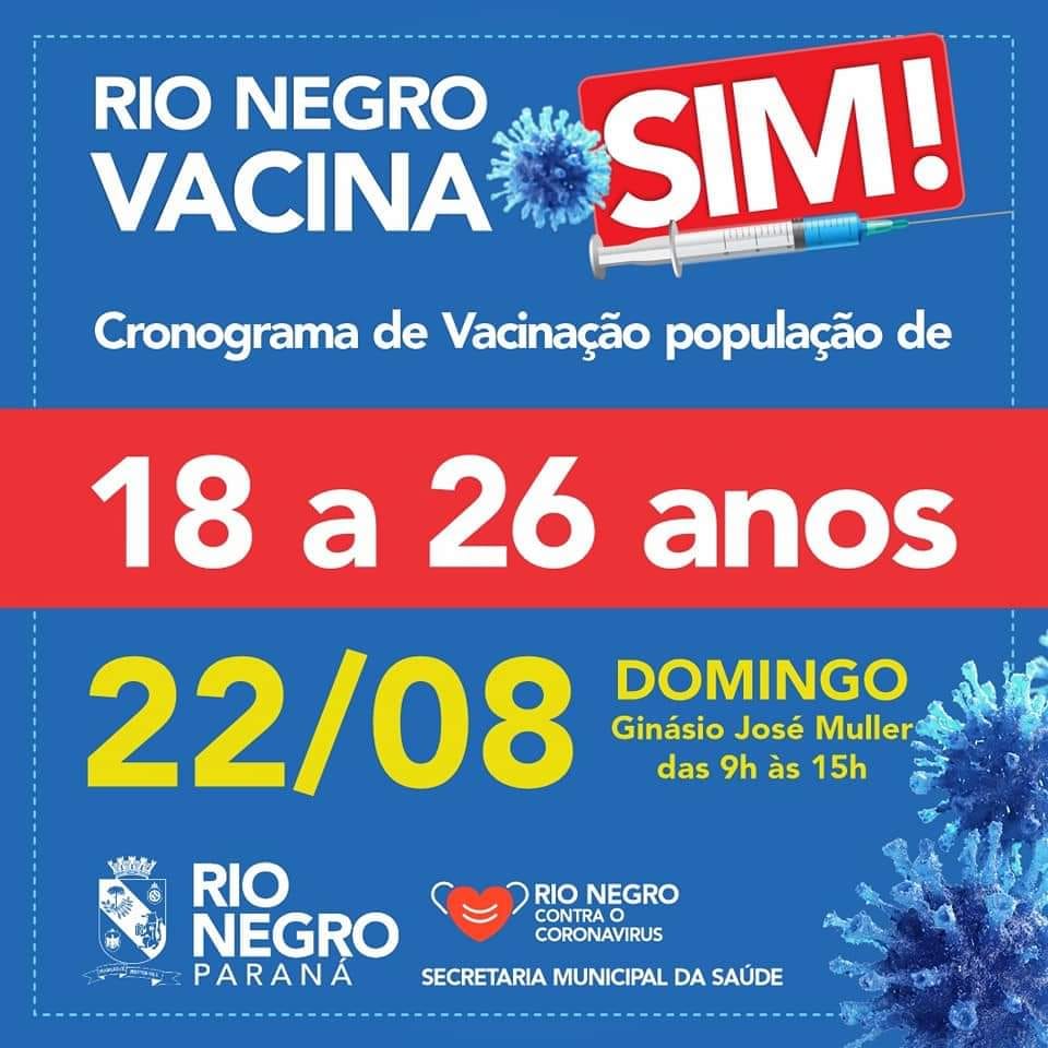 A Prefeitura Municipal de Rio Negro através da Secretaria Municipal de Saúde comunica que no dia 22 de agosto das 9h às 15h haverá mutirão de vacinação contra a COVID-19 para população de 18 a 26 anos.
