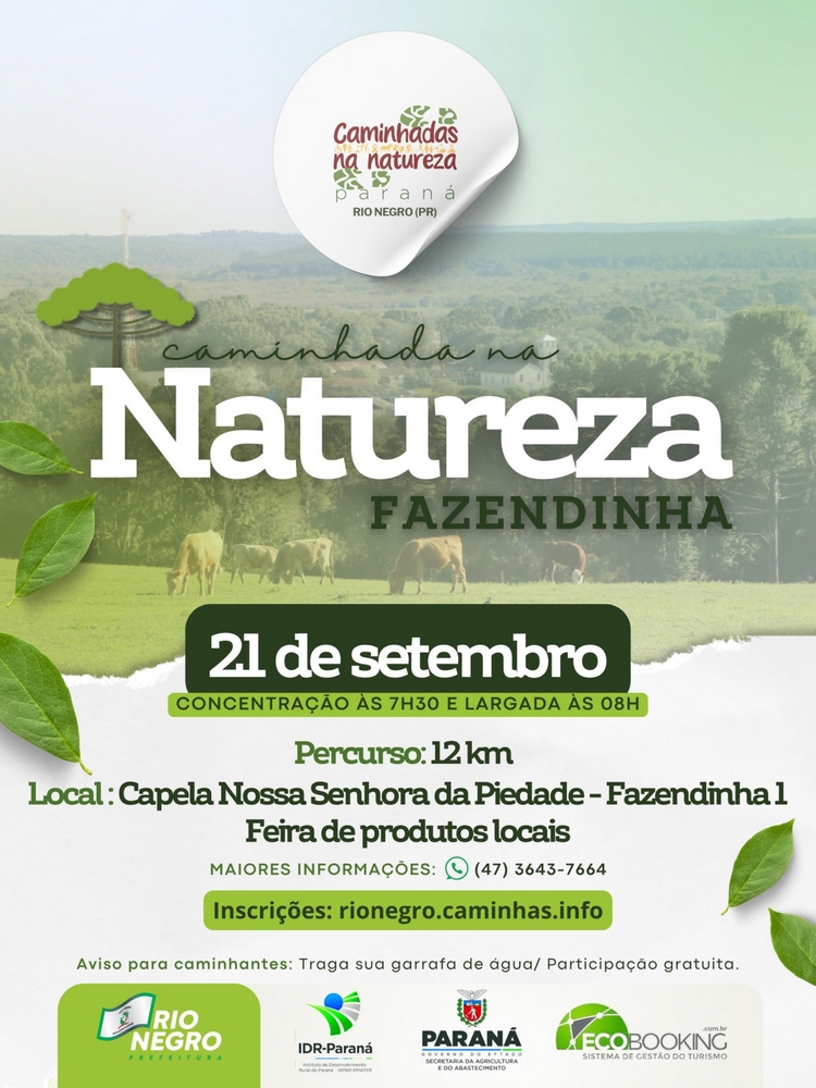 No próximo domingo será realizada na Fazendinha a 4ª Caminhada na Natureza em Rio Negro. O trajeto será de 12 km de trilhas e estradas. São belas paisagens que deixarão os participantes encantados.