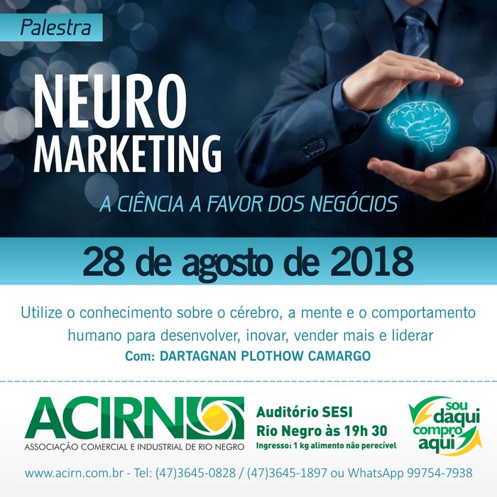 A Associação Comercial e Industrial de Rio Negro (ACIRN), promove de forma gratuita na noite do próximo dia 28, terça-feira, no auditório do Sesi, a palestra ‘Neuromarketing – A ciência a favor dos seus negócios’. Nela o palestrante Dartagnan Plothow Camargo explicará as forças por trás do comportamento humano no contexto de consumo e organizacional. Mostrará como utilizar o conhecimento sobre o cérebro para desenvolver, inovar, vender mais e liderar.