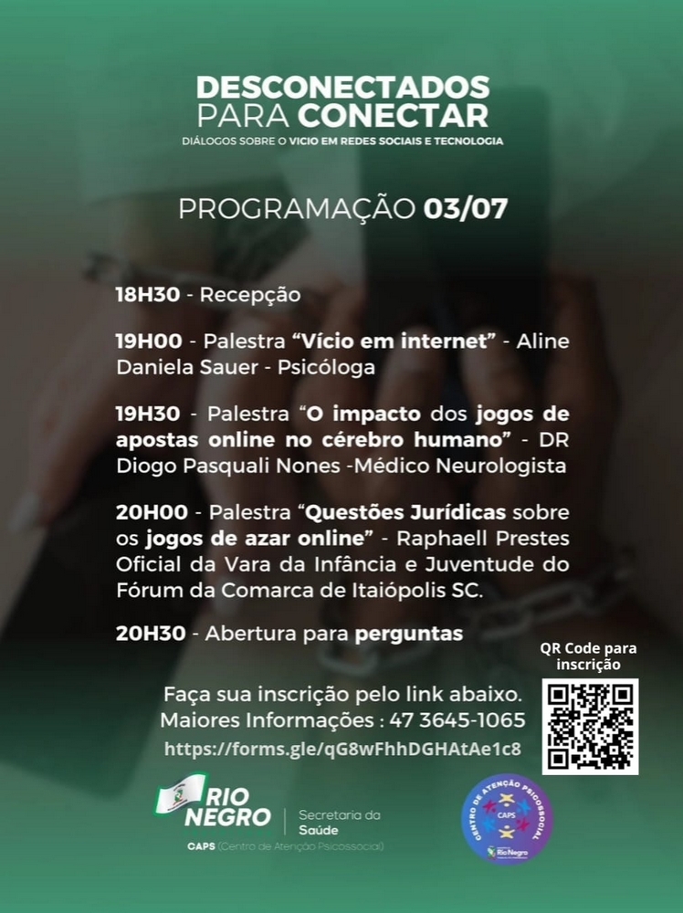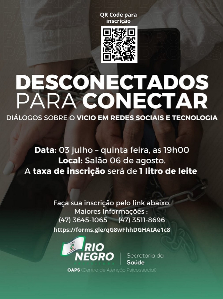 Nesta quinta-feira será realizado em Rio Negro o evento “Desconectados para conectar: diálogos sobre o vício em redes sociais e tecnologia” com as seguintes palestras gratuitas com os respectivos profissionais: