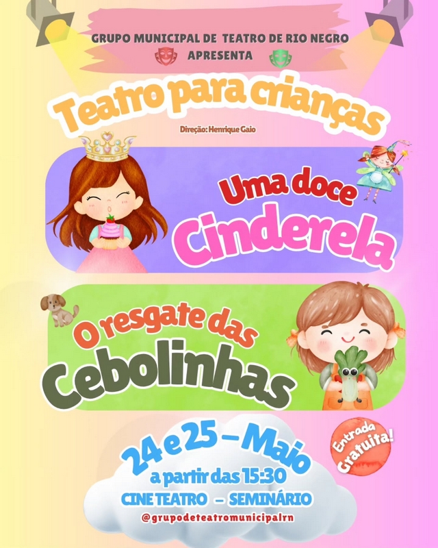 Serão duas apresentações com entrada gratuita: “O resgate das cebolinhas” e “Uma doce Cinderela”. A direção é de Henrique Gaio.