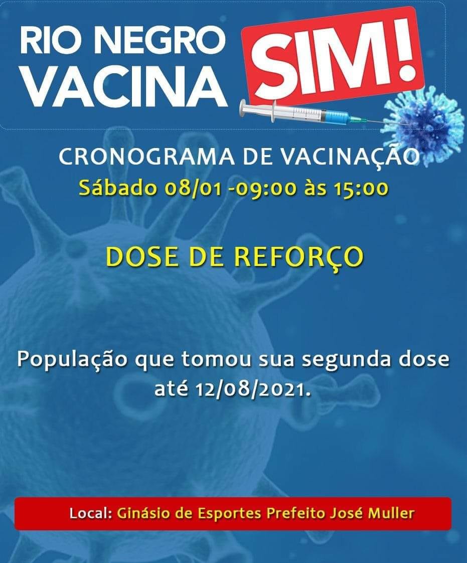 No mesmo dia será aplicada a dose de reforço da vacina contra a Covid-19 para o público que tomou a segunda dose até o dia 12 de agosto de 2021. Esta aplicação será realizada no Ginásio XV de Novembro.