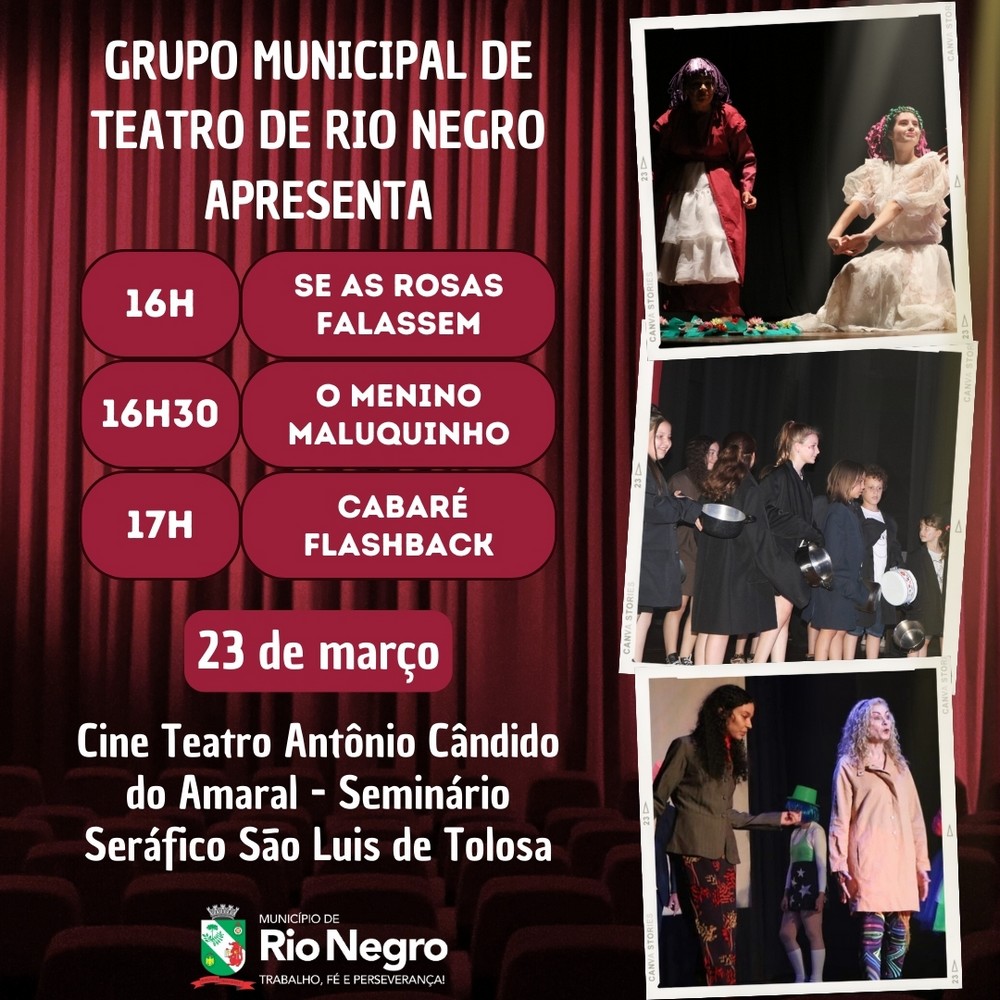 Durante a tarde deste sábado o Grupo Municipal de Teatro apresentará três peças que encantam e divertem o público. A programação também acontece no Cine Teatro Antônio Cândido do Amaral com entrada gratuita e classificação livre. Confira: