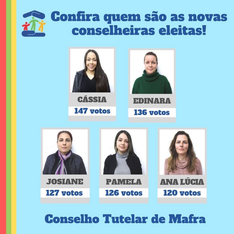 Pela primeira, vez o Conselho Tutelar de Mafra será 100% de mulheres, foram eleitas Cássia Regina da Silva Maidl (147 votos), Edinara Teresinha Witt Naldony (136 votos), Josiane Augustin Tibuski (127 votos), Pamela Cris Correia dos Santos (126 votos) e Ana Lúcia Miranda Leitão (120 votos). Ficaram como suplentes (do sexto ao décimo): 1ª suplente – Luzia Kraievski (114 votos), 2ª suplente – Lislane Aparecida Kiatkoski (103 votos), 3ª suplente – Iara Francini Ruttes Uhlig (103 votos), 4ª suplente – Camilla Bueno Mariano Diniz dos Santos (92 votos) e 5ª suplente – Rosangela de Fátima L. da S. C. dos Santos (91 votos).