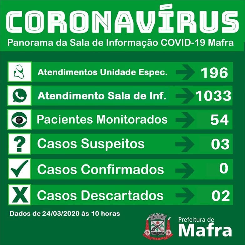 Desde o início da crise Mafra vem mantendo a Sala de Informação Covid-19 com o objetivo de informar a população sobre as diretrizes que devem ser tomadas quanto à situação do coronavírus. Com atendimento das 7h30min às 22h todos os dias da semana – telefone ou WhatsApp – o cidadão é atendido por um atendente profissional da saúde, para responder às dúvidas quanto ao coronavírus.