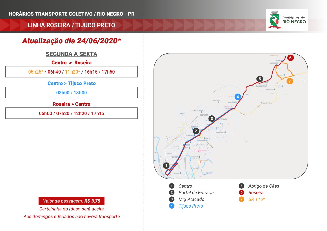 Desde o dia 9 de junho há o serviço de transporte emergencial de passageiros em Rio Negro. Vans e ônibus estão autorizados a prestar o serviço que estão sendo realizados com rotas urbanas com o valor da passagem a R$ 3,75, e com rotas no interior: Fazendinha com a passagem a R$ 6,00, Queimados com a passagem a R$ 5,00, SÃtio dos Rauen e Seminário a R$ 4,00 e Roseira com o valor de R$ 3,75.