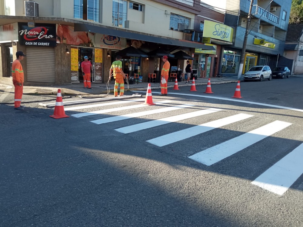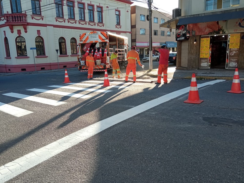 Nesta semana houve a pintura das sinalizações horizontais e das faixas de pedestres em diversos pontos da cidade. Parte do trabalho é realizada antes do amanhecer ou durante o domingo para não prejudicar o fluxo do trânsito.