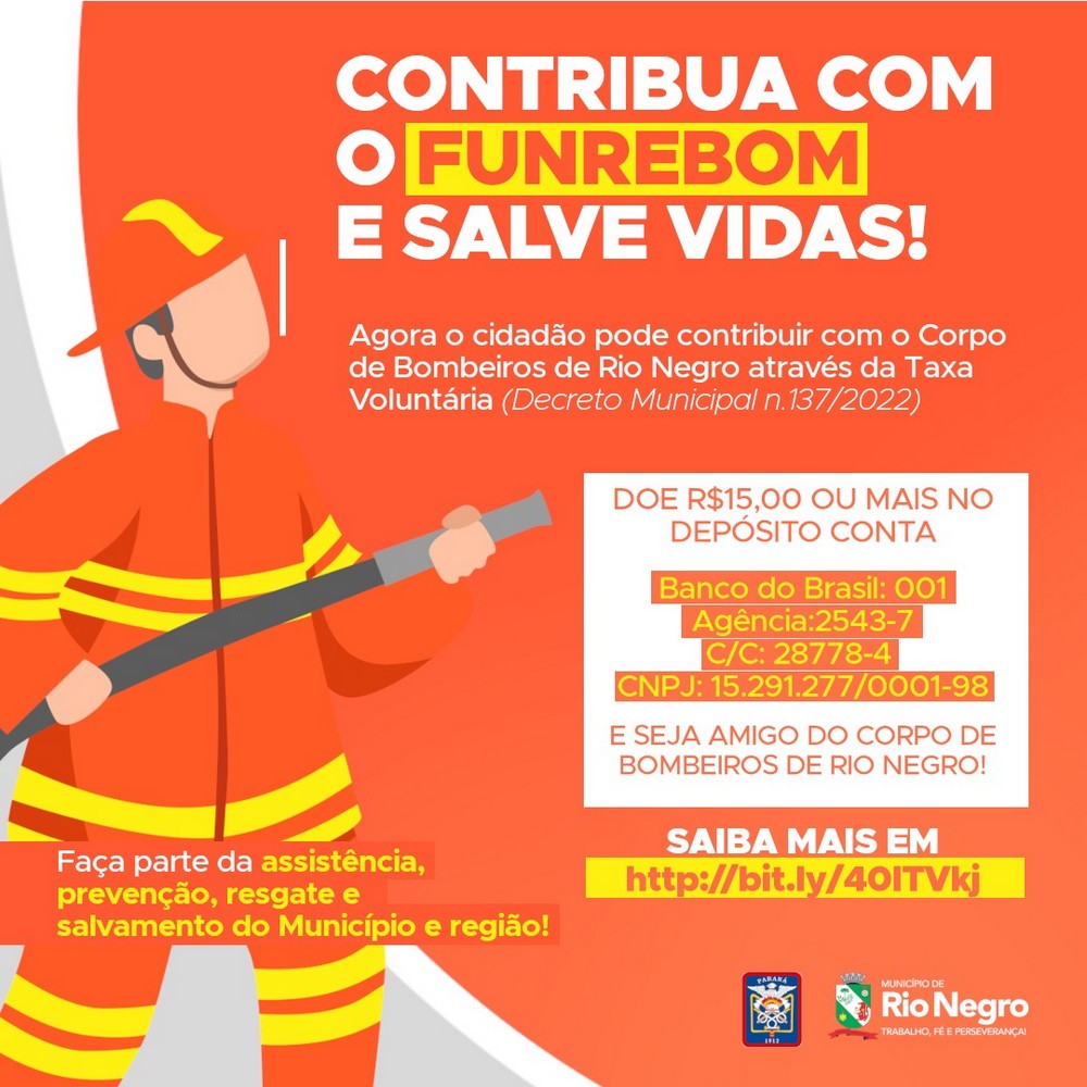 Em Rio Negro os cidadãos podem colaborar com Corpo de Bombeiros através do Fundo Municipal de Reequipamento do Corpo de Bombeiros (FUNREBOM).