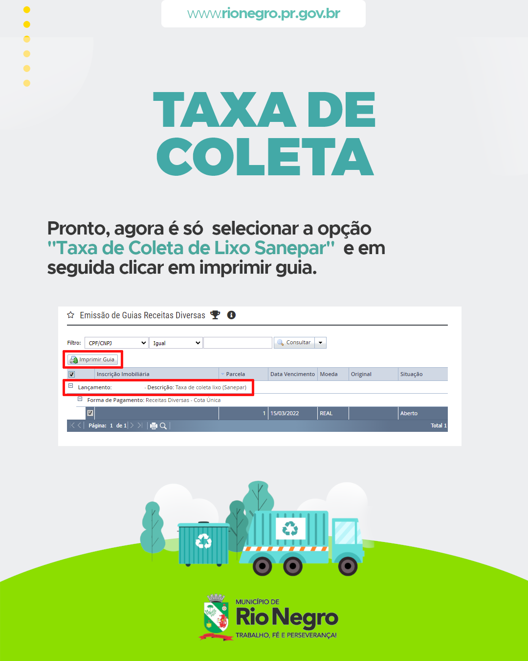 Em Rio Negro a guia para o pagamento da taxa de coleta de lixo 2024 já pode ser emitida facilmente pela Internet.