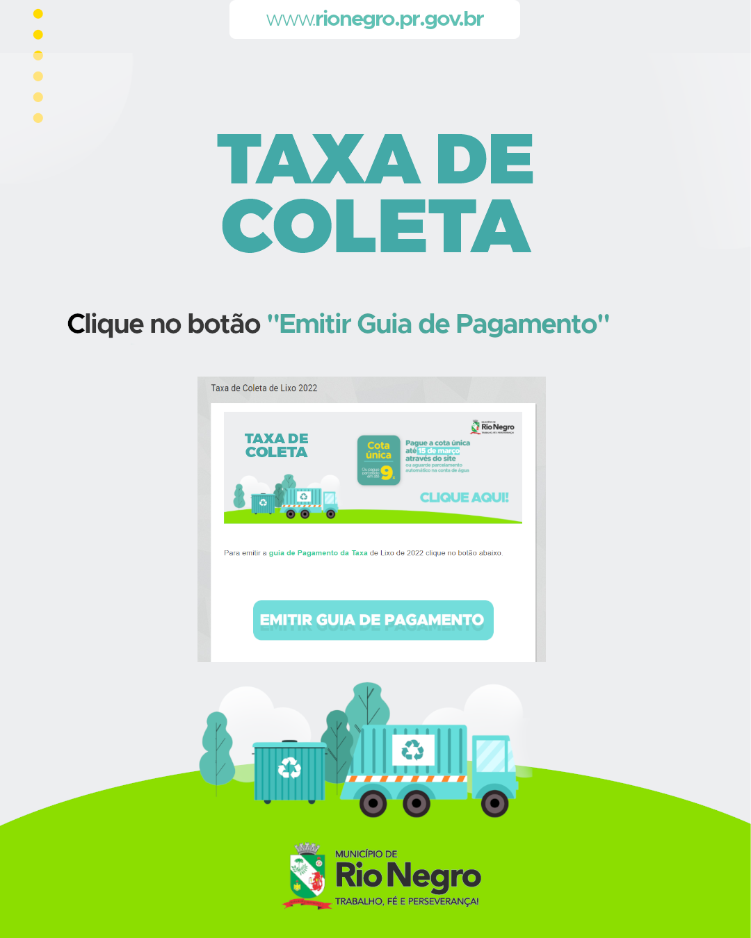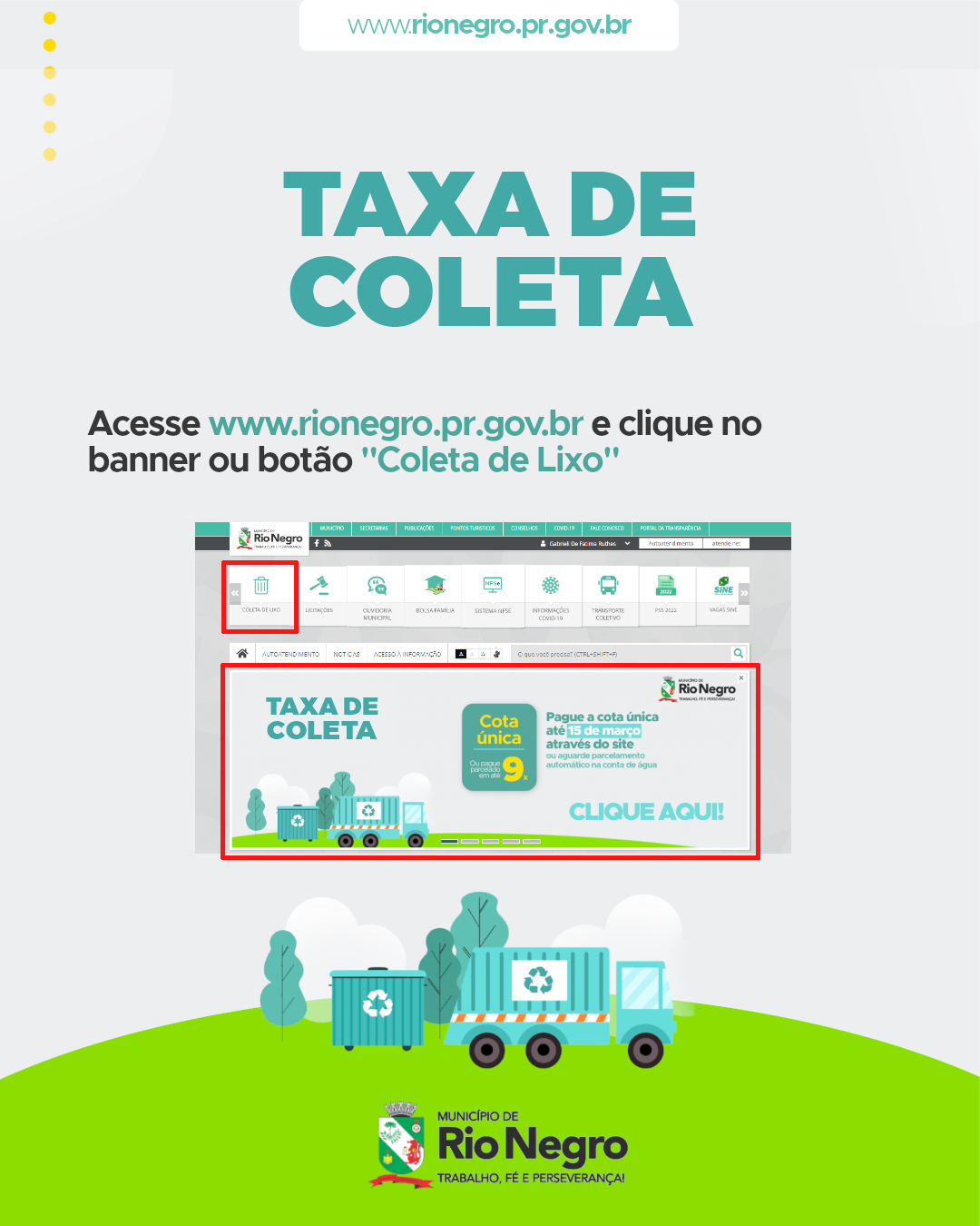 Para gerar o boleto pela Internet bastante acessar o portal da Prefeitura de Rio Negro (www.rionegro.pr.gov.br) e clicar na opção “Coleta de lixo”. Também é possível solicitar através do WhatsApp: 47 99199-7440.