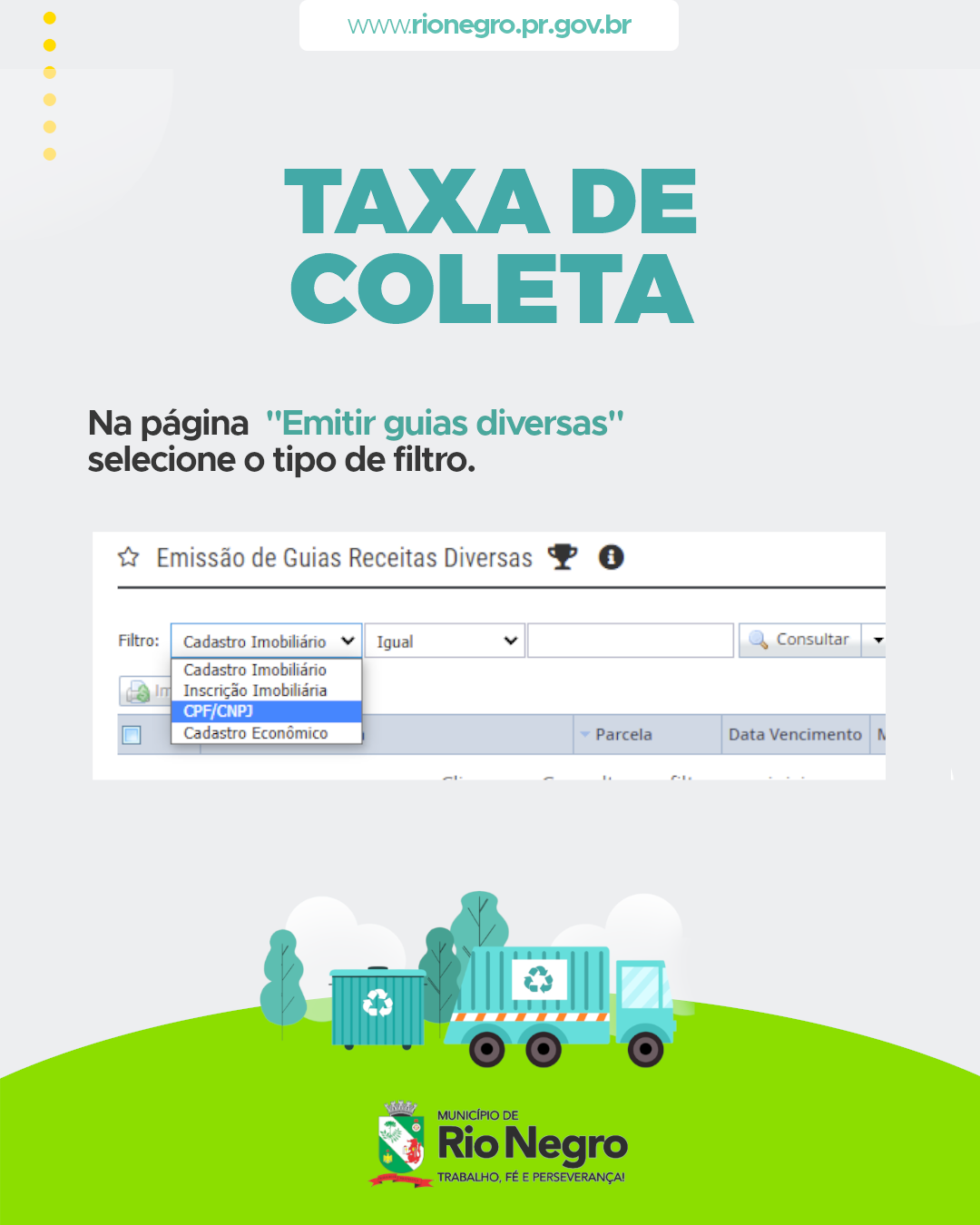 Em Rio Negro a guia para o pagamento da taxa de coleta de lixo 2024 já pode ser emitida facilmente pela Internet.