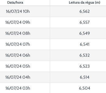 O nÃvel do rio Negro continua subindo nesta terça-feira (16/07/2024), mas num ritmo mais lento, felizmente. De acordo com o monitoramento hidrológico da Copel, à s 10h o nÃvel registrado foi de 6,55 metros. Em Rio Negro o limite entre enchente e inundação é de 6,90 metros na área urbana. No interior há alguns pontos de interdição.