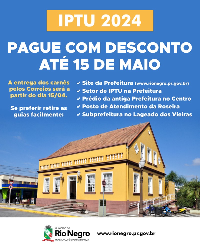 A entrega dos carnês pelos Correios ocorrerá a partir do dia 15 de abril, mas já é possível obter as guias de pagamento facilmente através da Internet. Para isso basta acessar o endereço www.rionegro.pr.gov.br e pesquisar por “IPTU” na barra de busca.