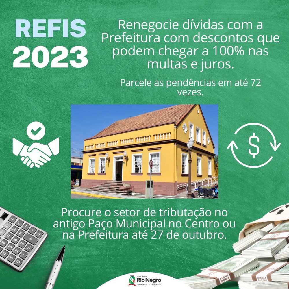Até o dia 27 de outubro, cidadãos e empresas podem renegociar as dÃvidas com a Prefeitura de Rio Negro obtendo descontos que podem chegar a 100% nas multas e juros. Além disso, podem parcelar as pendências em até 72 vezes. Isso é possÃvel através do Programa de Recuperação Fiscal (REFIS) 2023.
