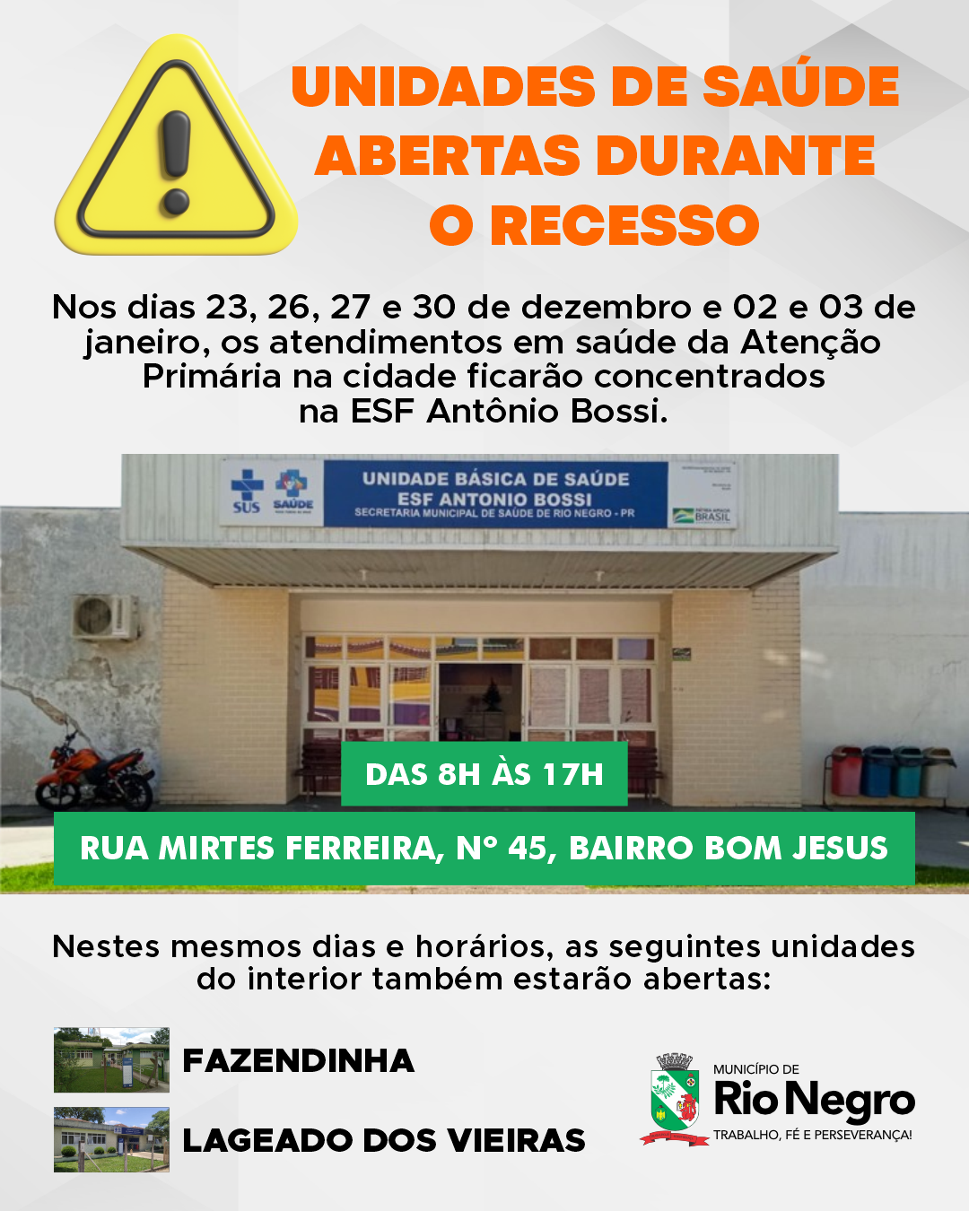 A Secretaria Municipal de Saúde de Rio Negro comunica que nos dias 23, 26, 27 e 30 de dezembro e 02 e 03 de janeiro, os atendimentos em saúde da Atenção Primária na cidade ficarão concentrados na ESF Antônio Bossi, que fica localizada na Rua Mirtes Ferreira, nº 45, no bairro Bom Jesus. O horário de atendimento é das 8h às 17h.