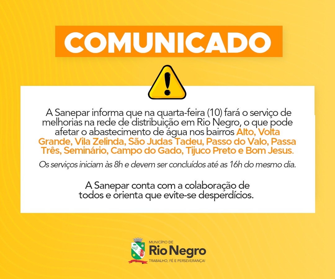 A Companhia de Saneamento do Paraná (Sanepar) informa que nesta quarta-feira (10) fará o serviço de melhorias na rede de distribuição em Rio Negro, o que pode afetar o abastecimento de água nos bairros Alto, Volta Grande, Vila Zelinda, São Judas Tadeu, Passo do Valo, Passa Três, Seminário, Campo do Gado, Tijuco Preto e Bom Jesus.