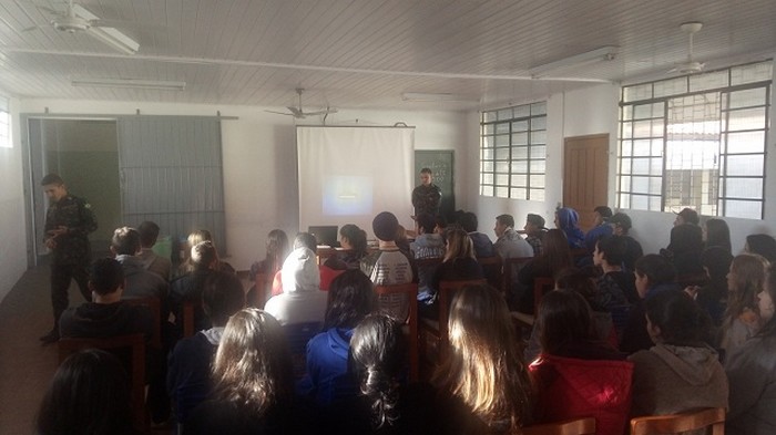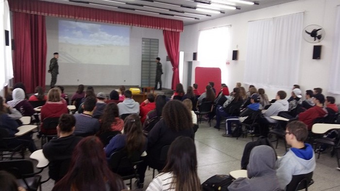 Nos dias 22 e 23 de junho, os Terceiros Sargentos do 5º RCC, Bruno Ramos Braga, Thales Cristiano Oliveira Alves, Regis Ribeiro Dos Santos, Wellington De Araujo Bittencourt e Pedro Felipe Silva Filgueira De Moraes, ministraram palestras na Escola Estadual Barão de Antonina, em Mafra, e no Colégio Estadual Dr. Ovande do Amaral, em Rio Negro.
