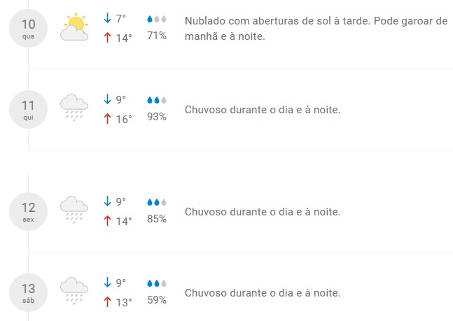 A situação deve persistir em todo o estado do Paraná pelo menos até domingo (14), quando começa a esquentar ao norte. Nas áreas mais ao sul, a previsão é que as temperaturas voltem a ficar acima dos 20ºC apenas no final da próxima semana, a partir de quinta-feira (18).
