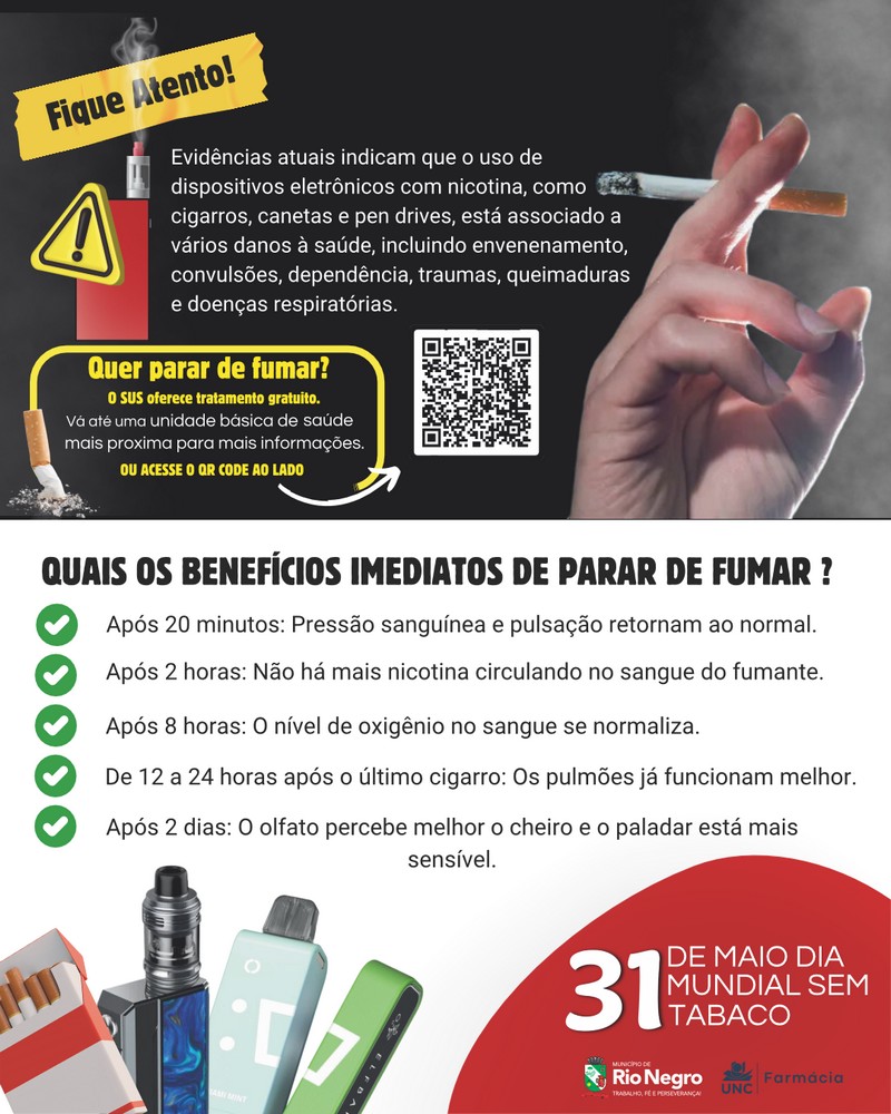 Hoje, 31 de maio, é o Dia Mundial Sem Tabaco. Em parceria com a UnC Farmácia a Secretaria Municipal de Saúde de Rio Negro está divulgando um material que mostra os benefícios imediatos ao parar de fumar. O material também alerta sobre os malefícios do uso de dispositivos eletrônicos que possuem nicotina.