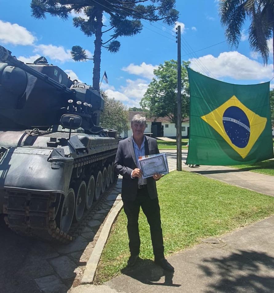 Representando todos os servidores da Secretaria de Obras, Serviços Urbanos e Habitação, na manhã da última quarta-feira o secretário municipal Edson José Guenther recebeu na 11ª Bateria de Artilharia Antiaérea Autopropulsada (11ª Bia AAAe AP) o diploma “Amigo da Bateria”, como forma de agradecimento pelo apoio e consideração da secretaria a esta organização militar durante este ano de 2023.