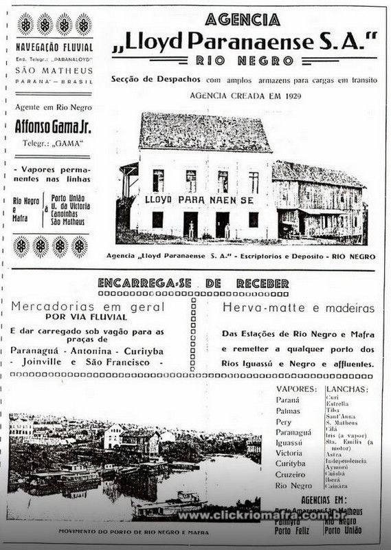 Em 1929 foi fundada a Agência do Lloyd Paranaense em Rio Negro, funcionando no imóvel situado na rua Riachuelo. Muitos traços, inclusive do ancoradouro de barcos ainda estão intactos.
