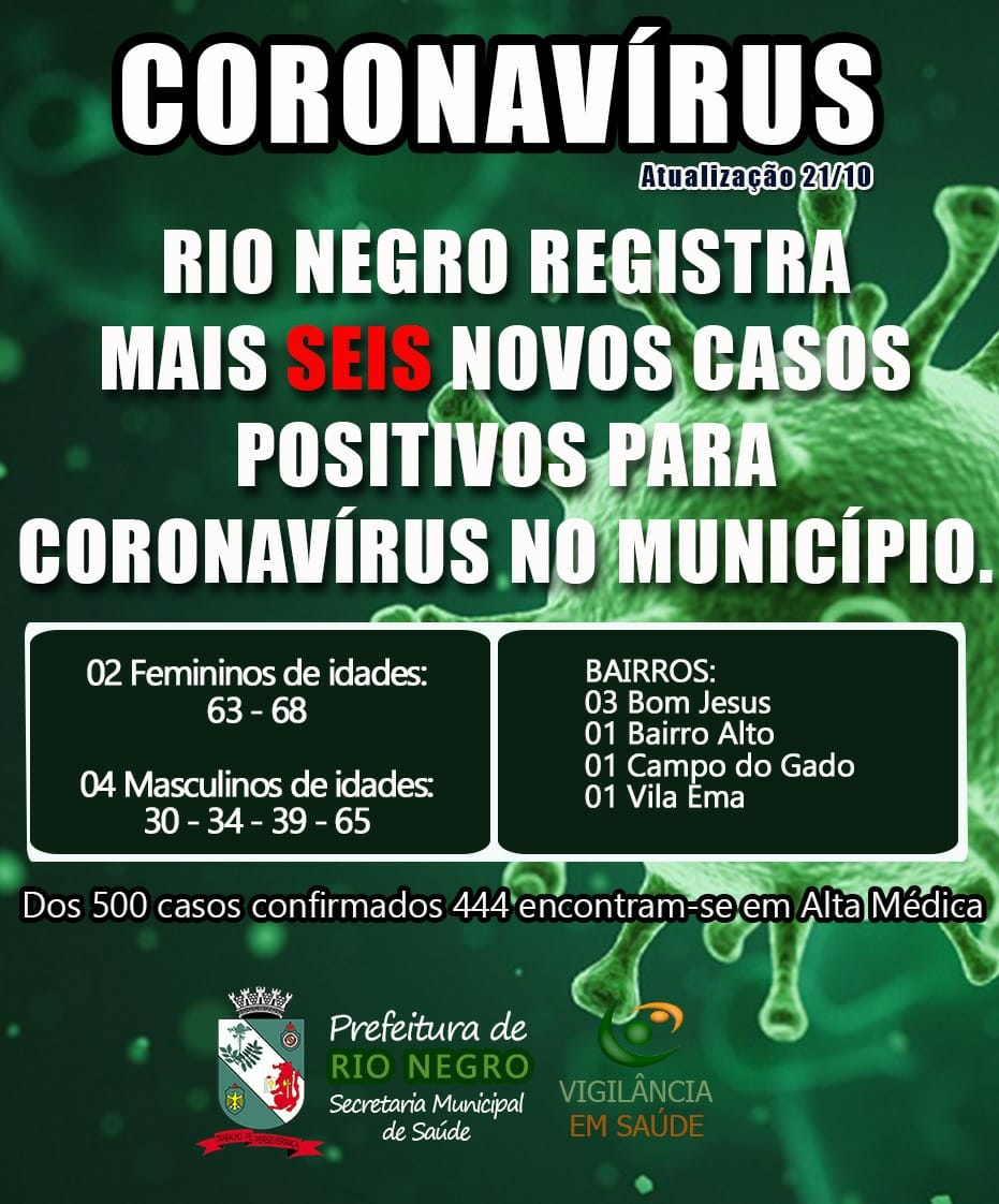 A cidade de Rio Negro confirmou seis novos casos positivos de Covid-19 nesta quarta-feira. Confira o boletim divulgado pela prefeitura: