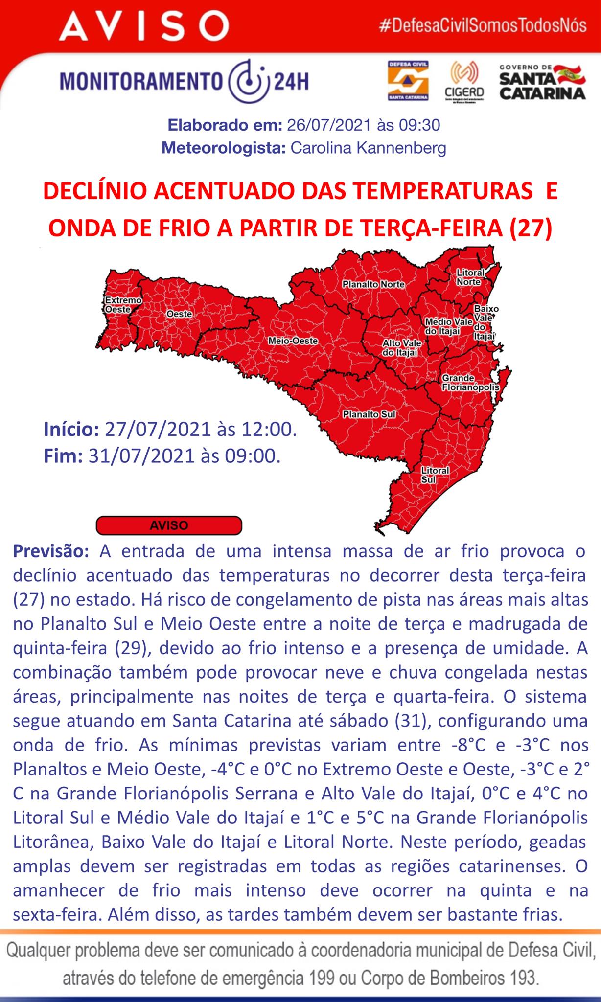 Em Rio Negro, Mafra e região o frio chegará com força. A Defesa Civil de Santa Catarina confirmou nesta segunda-feira a queda das temperaturas e intensa onda de frio a partir desta terça-feira.