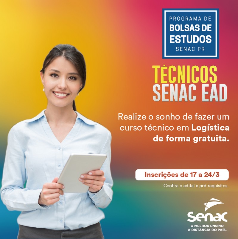 Em parceria com o Senac-RS, responsável pelos cursos técnicos EAD, o Senac PR disponibiliza essas Bolsas de estudo por meio do Programa Senac de Gratuidade (PSG). Em Rio Negro, há vagas para o curso Técnico em LogÃstica. As inscrições estão abertas, de 17 a 24 de março e devem ser realizadas somente pela internet, no site www.ead.senac.br/gratuito