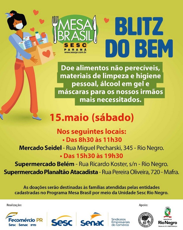 Além do comércio local, a ação conta com parceiros especiais: o Grupo de Escoteiros Falcão Negro e a Secretaria de Assistência Social, ambos de Rio Negro. As doações serão destinadas às famílias atendidas pelas entidades cadastradas no Programa Mesa Brasil por meio da Unidade Sesc Rio Negro.