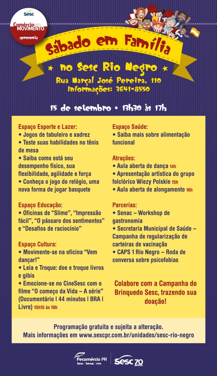 Serão diversas atividades gratuitas neste sábado (15) das 13h30 às 17h. Confira na imagem a programação completa. O Sesc Rio Negro fica localizado na Rua Marçal José Pereira, 110.