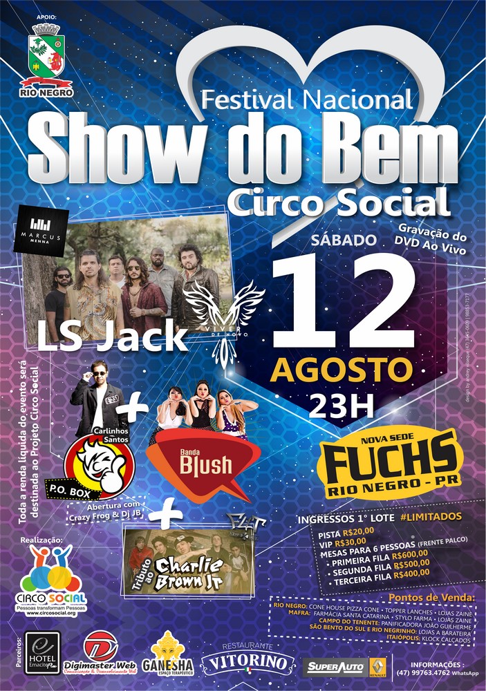 A banda LS Jack, através do projeto “Viver de Novo” do cantor Marcus Menna, fará um grande show em Rio Negro no dia 12 de agosto, juntamente com outras grandes atrações no Festival Show do Bem, promovido pelo projeto Circo Social. Toda a renda do evento será destinada às ações do projeto, que realiza atividades beneficentes em Riomafra e região. Prestigie e colabore com uma boa causa.