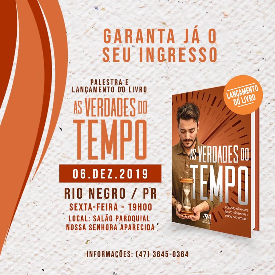 Já é possÃvel obter ingressos para a palestra e lançamento do livro “As verdades do tempo”, de Thiago Brado. O evento será nesta sexta-feira (06), à s 19h no Salão Paroquial da Igreja Nossa Senhora Aparecida de Rio Negro. Os ingressos podem ser obtidos da secretaria da igreja. Mais informações: (47) 3645-0364. Na compra de um ingresso você ganha um livro autografado.