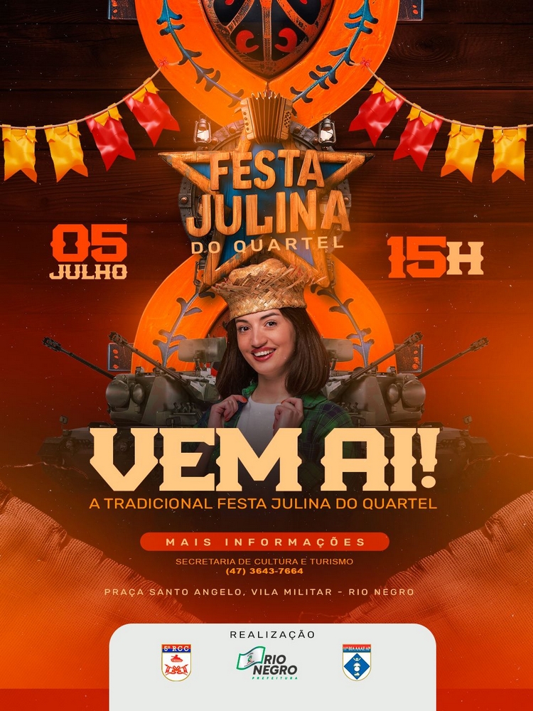 Rio Negro terá uma super festança no próximo mês! A tradicional Festa Julina do Quartel será realizada no dia 05 de julho, a partir das 15h.