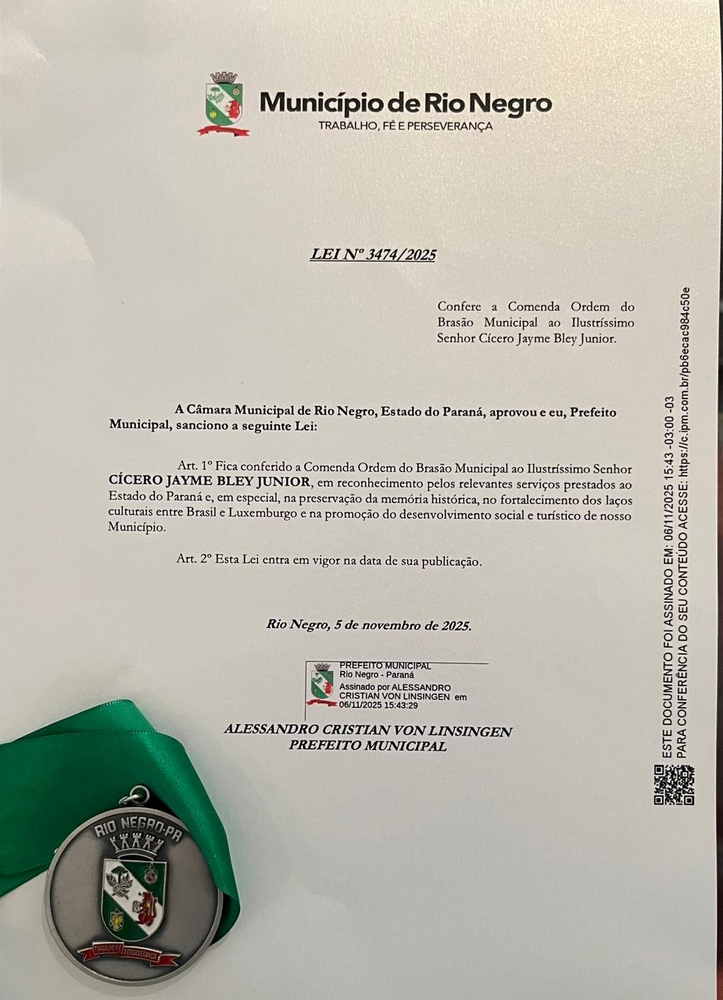Sua contribuição, contudo, não se limita ao nosso território. Detentor também da nacionalidade luxemburguesa, o senhor Cícero representa um elo vivo entre o Paraná, o Brasil e o Grão-ducado de Luxemburgo, aproximando continentes e compartilhando conhecimento.