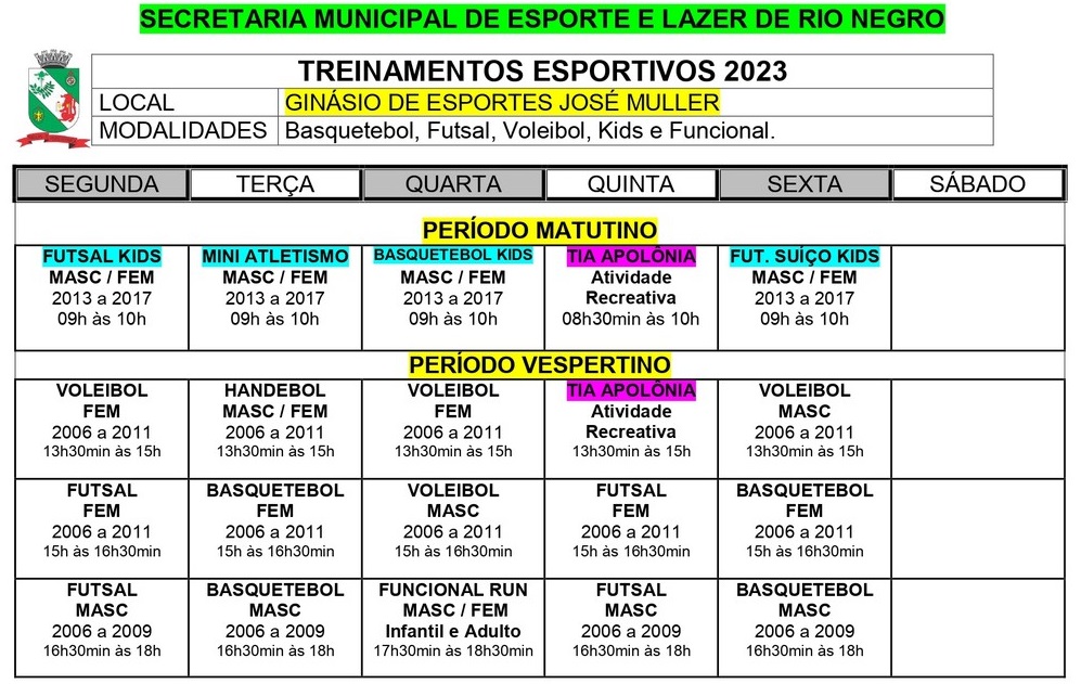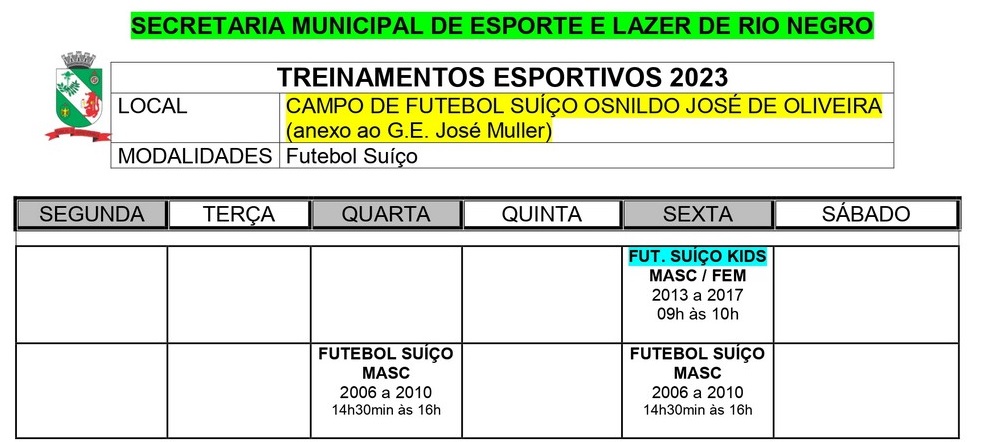 Os treinamentos serão realizados no Ginásio de Esportes José Müller e no Campo De Futebol SuÃço Osnildo José de Oliveira (anexo ao ginásio). Confira nas imagens o cronograma.