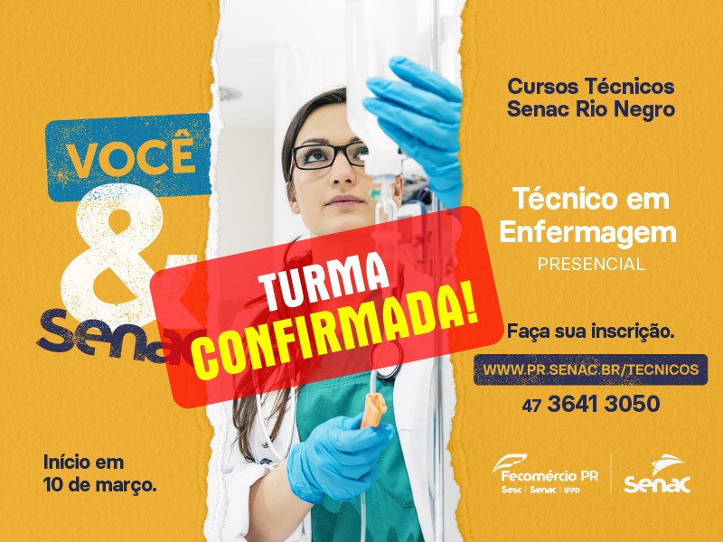 Turma confirmada para o curso Técnico em Enfermagem no Senac Rio Negro. Você ainda pode fazer parte! É um dos cursos técnicos com maior empregabilidade. Faça na melhor escola! O curso terá inÃcio nesta terça-feira. Corre que ainda dá tempo de se inscrever! Inscreva-se agora pelo site www.pr.senac.br/tecnicos ou na unidade: Rua Marçal José Pereira, 100.
