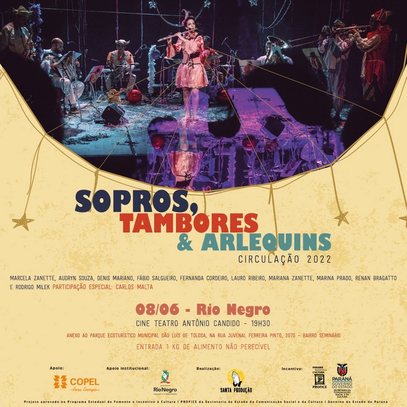Um espetáculo musical lúdico que resgata a alegria dos coretos com músicos fantasiados de personagens da Commedia dell’arte e interpretando composições próprias ao lado de clássicos de Chiquinha Gonzaga e Noel Rosa. Essa é a proposta do show Sopros, tambores e arlequins que chega a Rio Negro na quarta-feira, dia 8, às 19h30, para única apresentação no Cine Teatro Antônio Candido (Rua Juvenal Ferreira Pinto, 2070 – Anexo ao Parque Ecoturístico Municipal São Luís de Tolosa). No palco uma trupe colorida e animada proporciona ao público uma viagem musical e cênica pelos coretos do Brasil com a participação muito especial do multi-instrumentista Carlos Malta.