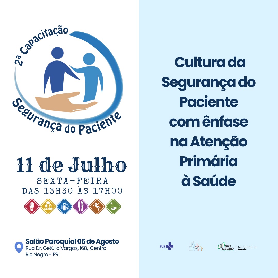 Nesta sexta-feira, dia 11, a Secretaria Municipal de Saúde de Rio Negro realizará a 2ª Capacitação Segurança do Paciente. O tema deste ano será: “Cultura da segurança do paciente com ênfase na Atenção Primária à Saúde”.