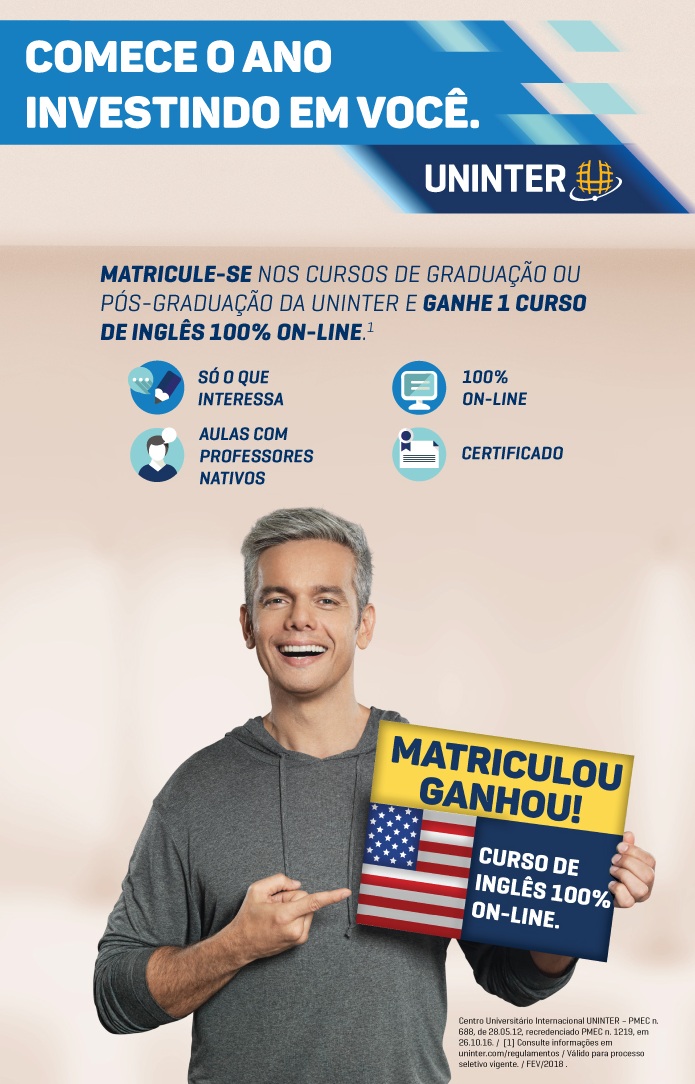Ganhe 1 curso de inglês ao realizar sua matrÃcula nos cursos de graduação ou pós-graduação da Uninter. As inscrições e a realização do vestibular vão até o dia 20 de fevereiro. Para efetuar a inscrição, basta comparecer ao polo.