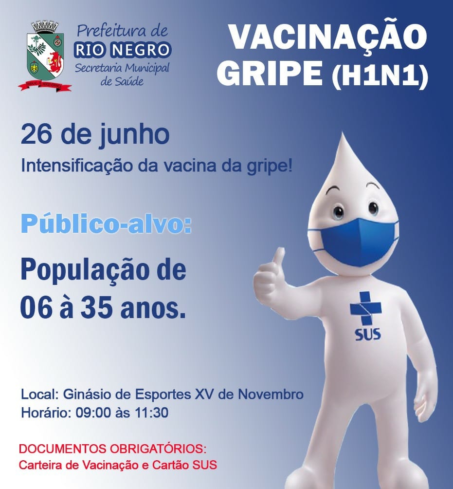 Neste sábado (26) a Secretaria de Saúde de Rio Negro realizará uma intensificação da vacina da gripe. O público-alvo é a população de 06 a 35 anos de idade. A vacinação será no Ginásio XV de Novembro, das 9 às 11h30. Confira na imagem as informações.
