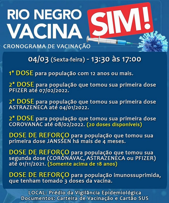 Nesta sexta-feira (04) mais de mil pessoas foram vacinadas em Rio Negro contra a Covid-19 (entre primeira e segunda dose e também a dose de reforço).